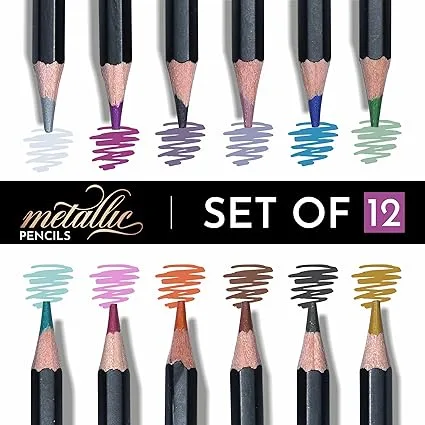 - Complete Metallic Set: A curated collection of 12 vibrant, metallic-colored pencils, each crafted to deliver bold shimmer effects on various surfaces.