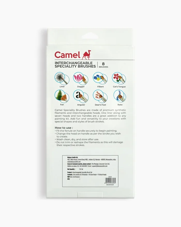Discover the versatility and precision of the Camel Interchangeable Speciality Brushes Set of 8, designed for artists who value flexibility, convenience, and professional quality. This unique brush set features 8 specialty brush heads with an interchangeable handle system, allowing you to easily switch between brush types without carrying multiple full-sized brushes. Perfect for studio use or painting on the go, this set combines practicality with performance. Crafted with high-quality synthetic and natural bristles, each brush head is engineered to deliver smooth, controlled strokes across a variety of mediums, including acrylics, oils, watercolors, gouache, and mixed media.