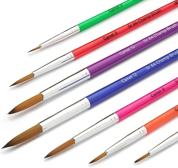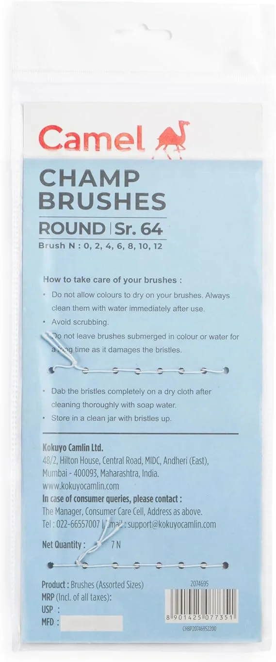 Bring your creativity to life with the Camel Champ Round Brush Set – Pack of 7 (Multicolor), a versatile collection designed for artists, students, and hobbyists. This premium brush set includes seven round brushes in assorted sizes, making it perfect for detailed line work, smooth strokes, shading, and blending across different painting techniques. Crafted with high-quality, durable bristles, the brushes hold color beautifully and deliver consistent results on a variety of surfaces including paper, canvas, fabric, and boards. The multicolor handles not only add a vibrant touch but also make it easy to identify brush sizes at a glance.